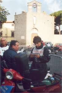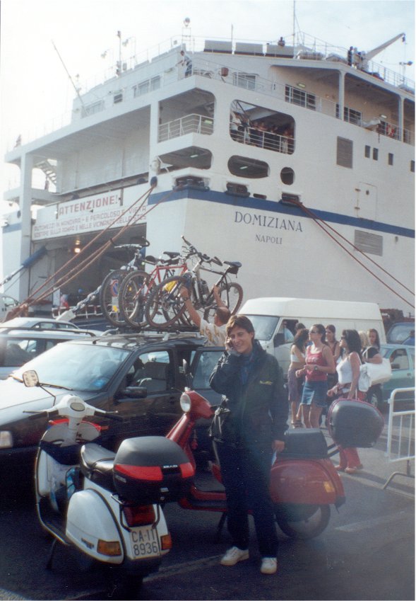 a SX Marianne al telefono con Monica mentre le comunica che la squadra ha vinto il titolo Europeo. Come al solito i Vespisti Sardi devono fuggire a prendere il traghetto prima delle premiazioni !!! |